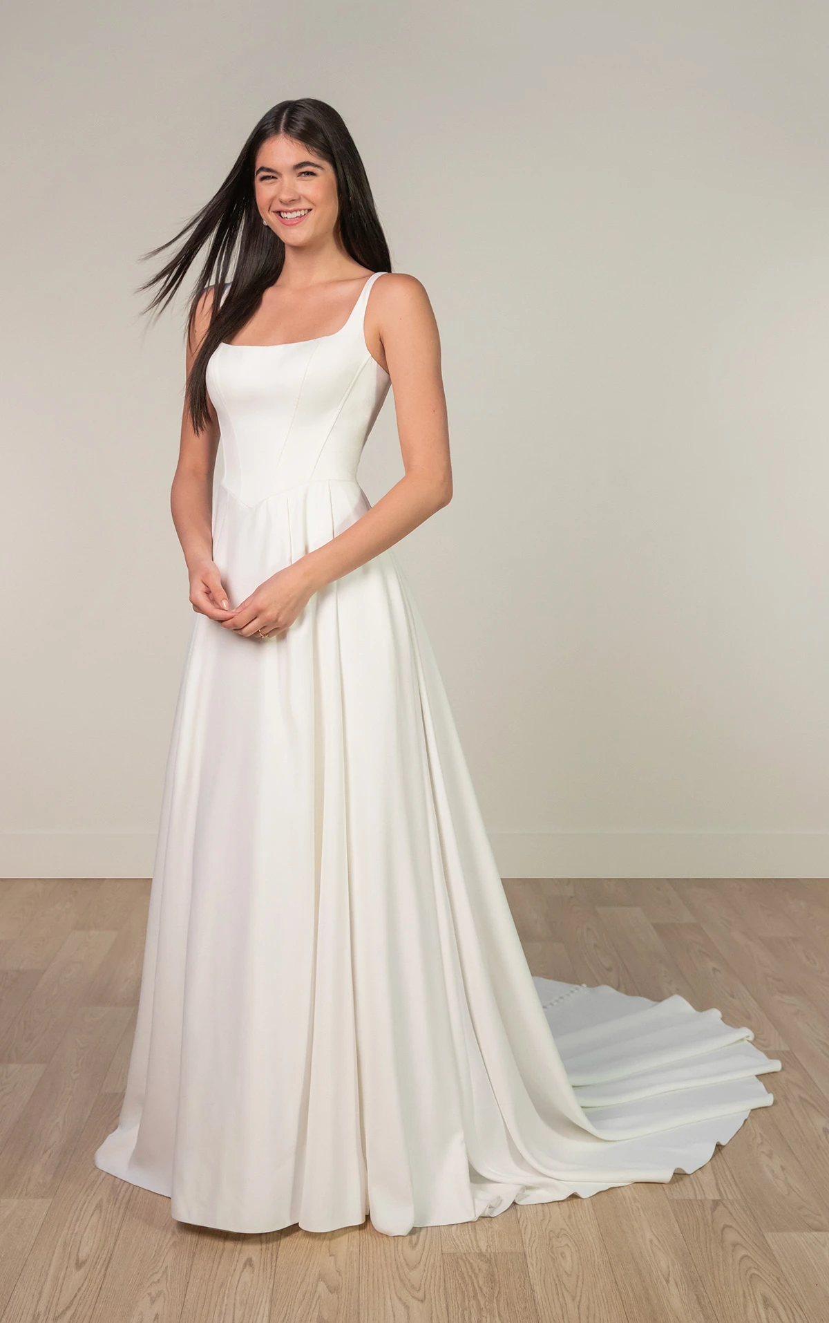 Modern and refined, this style offers a fresh take on timeless bridal design. Crafted in rich Matte Satin, the gown features wide straps and a clean square neckline that highlight the structured bodice. Contoured seams and an angled waist create a flatting shape, offering support and a tailored feel. A lightweight A-line skirt falls softly from the waist, providing graceful movement and a relaxed take on classic bridal ballgowns. This sleek and elegant gown blends simplicity with contemporary edge.