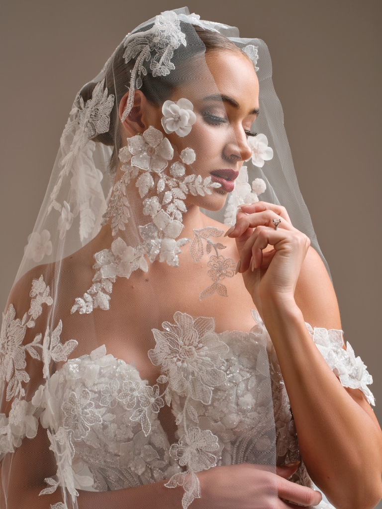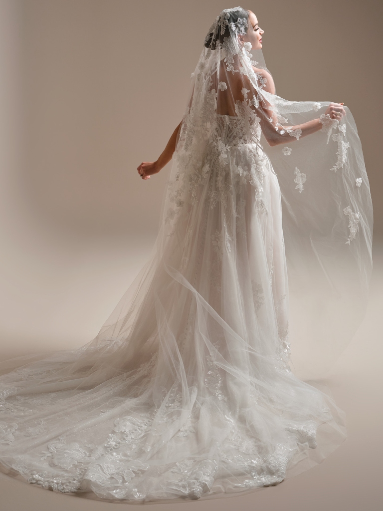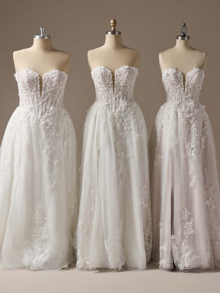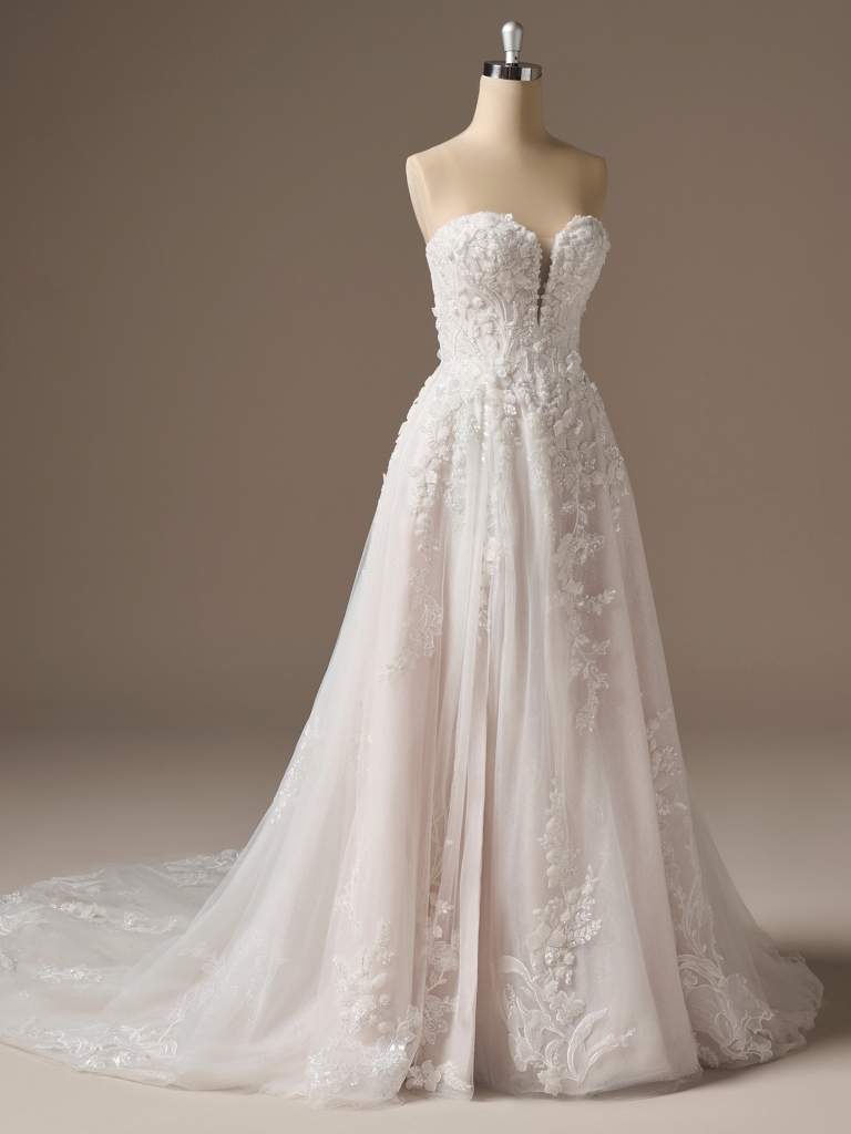 Intricate A-line wedding dress with 3-D beaded lace, sweetheart neckline, and thigh-high slit