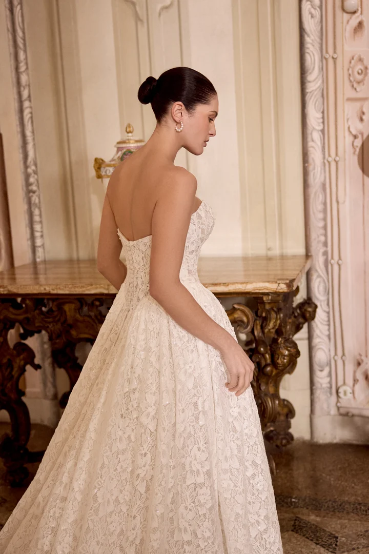 Allover beaded & sequined lace ball gown with strapless sweetheart neckline. Lace is adorned with sequins, crystals, and pearl beading throughout. Sheer bodice reveals subtle exposed boning which leads to a Basque waistline. Skirt features gathering on both sides which is emphasized by detachable hip puffs. Finished with buttons to the back Basque waistline. Complete with chapel length train with horsehair hem.