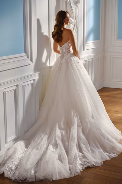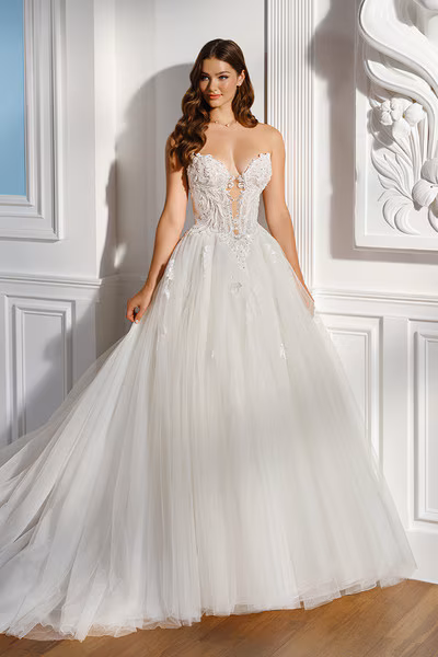 A plunging illusion sweetheart neckline makes a striking statement on this strapless ball gown, accented by sparkling beading and lace appliqué. Soft organza and glittering tulle flow from the bodice, creating movement and drama.