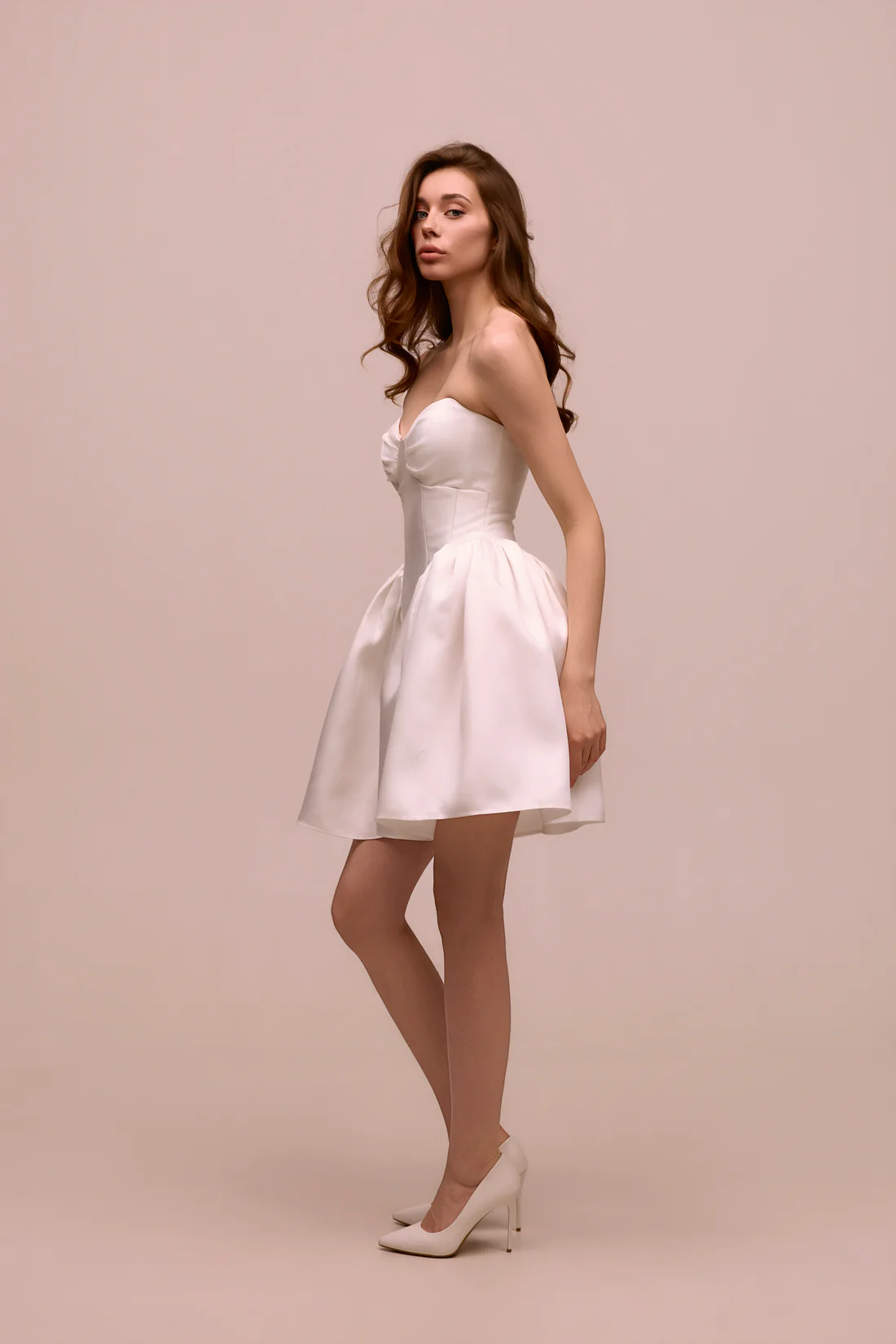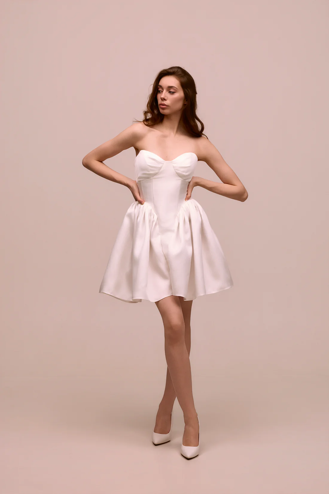 Bold in silhouette and minimalist in spirit, this mini dress commands attention with a structured sweetheart bodice and voluminous pleated skirt. Clean lines and architectural shaping make this the ultimate modern reception look.