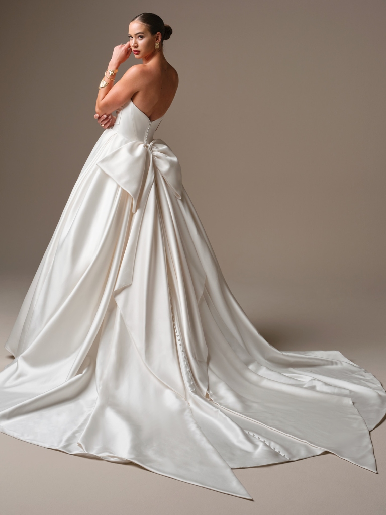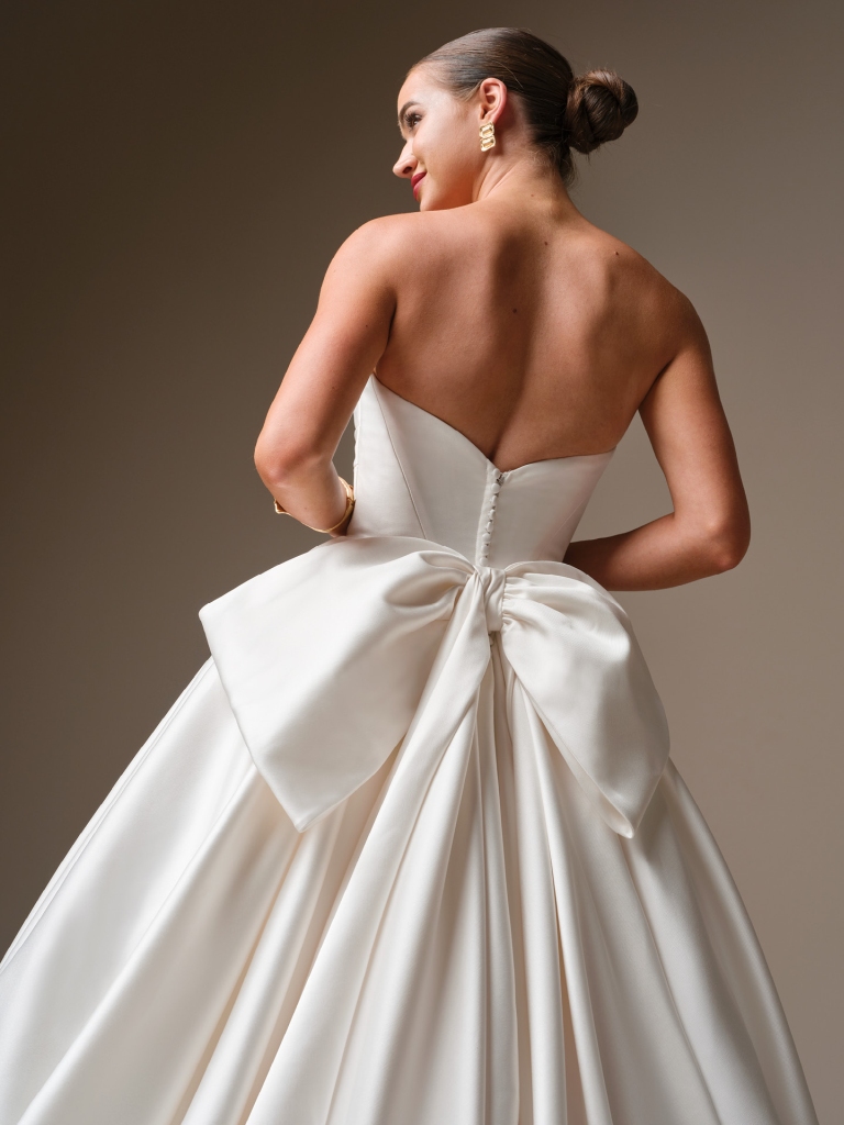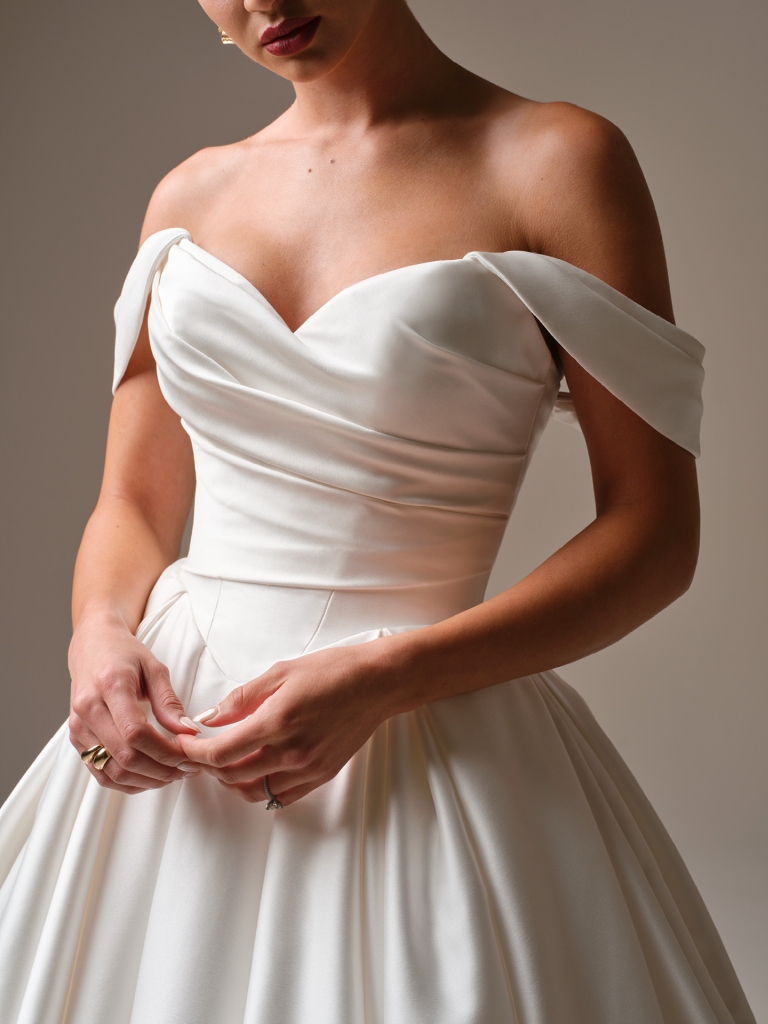 Graceful satin strapless draped bodice basque waist corset ballgown wedding dress